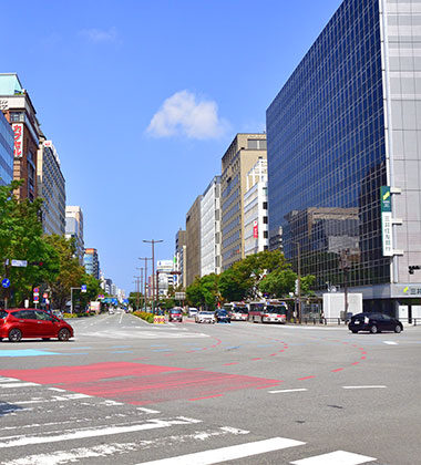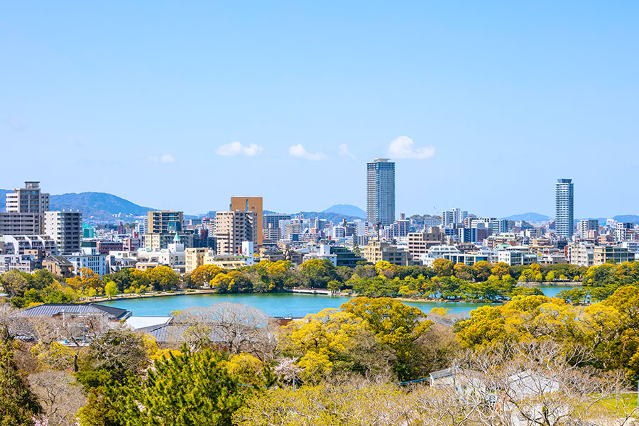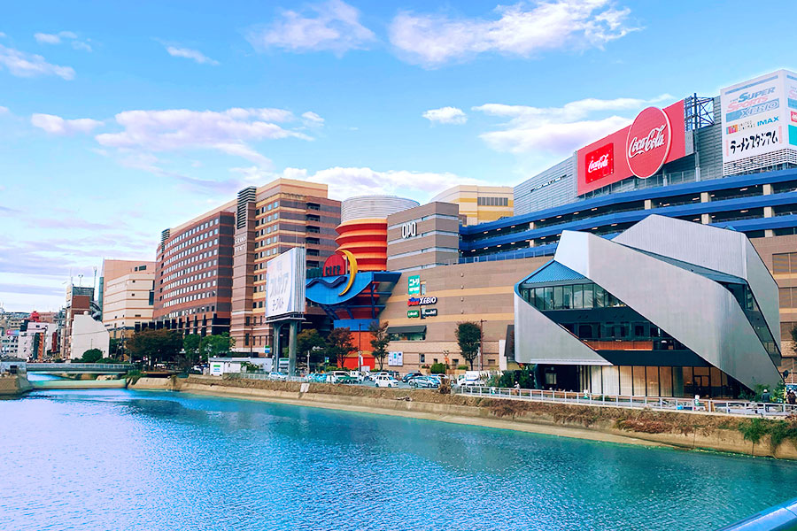 本校は「アジアの玄関口」として栄えている福岡市の中心部、博多にあります。歴史と現代が融合した魅力的なエリアで、博多は古くから栄え、今もなおその伝統と活気が感じられます。JR博多駅を中心に広がるエリアでは、歴史的な寺社や伝統工芸、そしてグルメが楽しめます。学校はJRや地下鉄の博多駅から徒歩5分の場所にありアクセスも抜群です。周辺はデパート、コンビニエンスストアやアパレルショップ、飲食店、薬局、病院などがあり、とても生活しやすい環境です。
